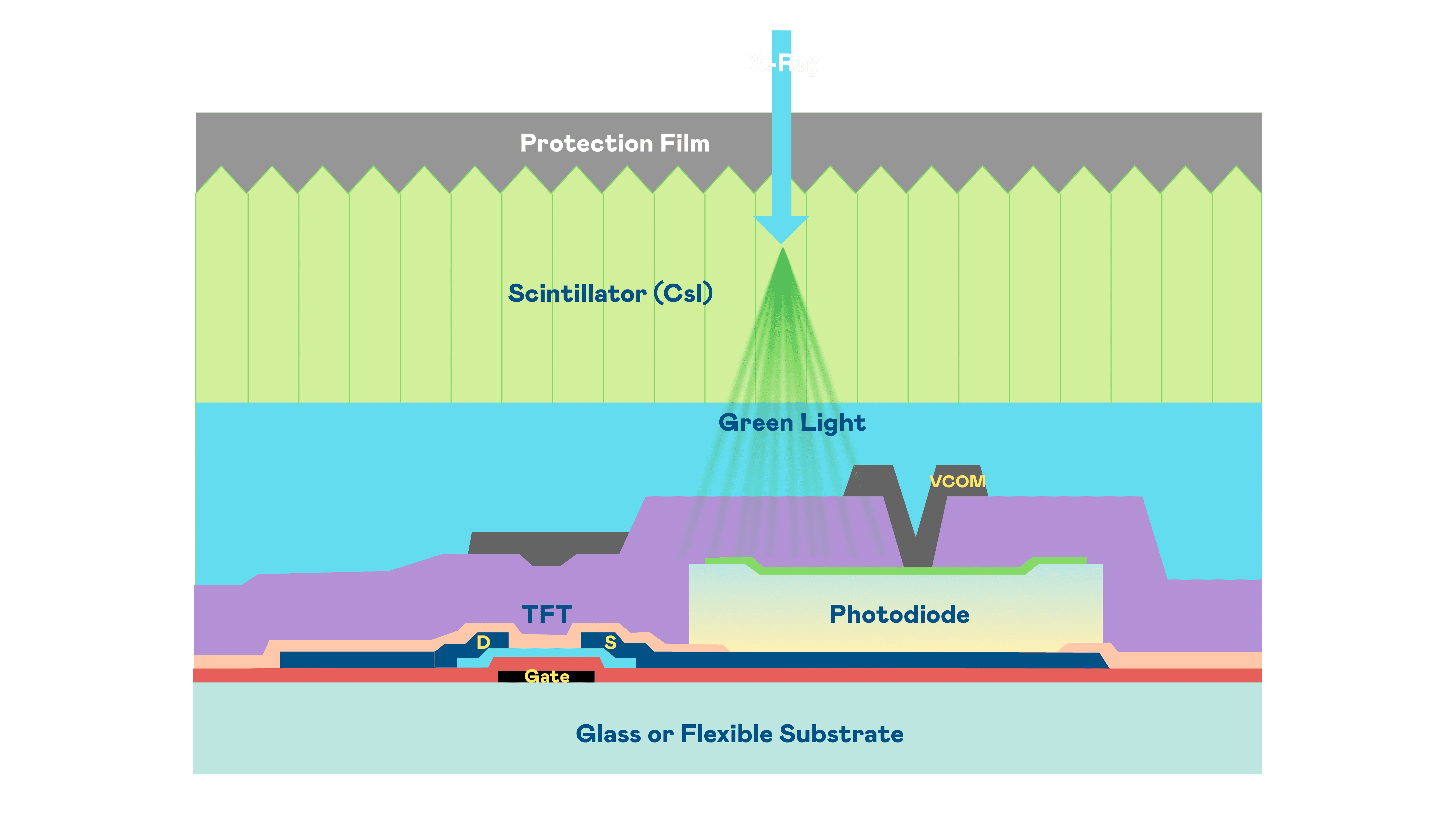 开云电子的X光影像感测阵列使用薄膜电晶体 (TFT) 作为每个像素的读取开关,,,搭配光电二极体(Photodiode)的光电转换元件,,,,用以感测X光影像讯号。。。
